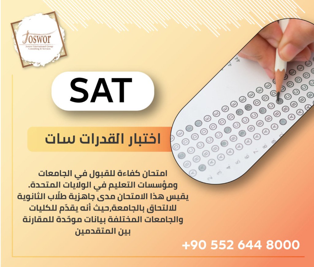 ?#اختبار_السات_SAT? تطلب العديد من الجامعات حول العالم شهادة الـ سات كمتطلّب للقبول فيها، ممّا يجعل من هذا الاختبار أحد مفاتيح الوصول إلى التعليم العالي في الجامعات الأمريكية بالإضافة إلى عدد من الجامعات العربية وخاصّة في...